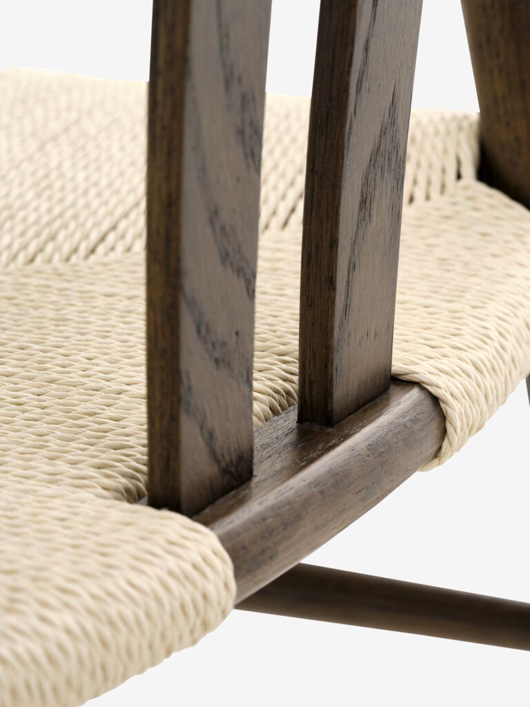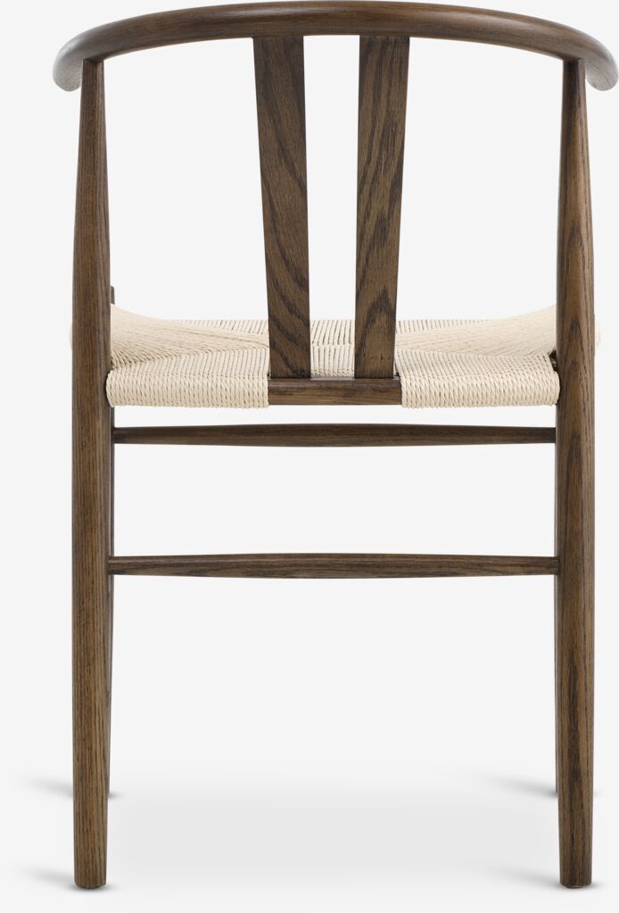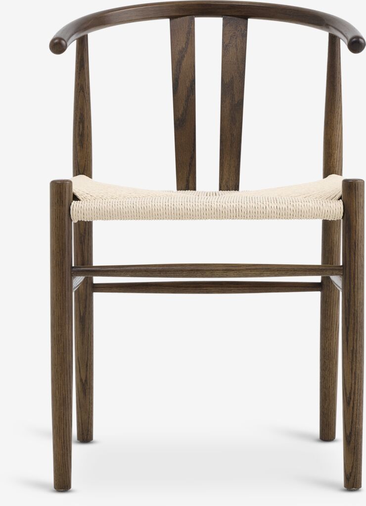 Blagovaonska stolica sa sjedalom od tkanog papirnatog užeta. Okvir od tamnog masivnog hrasta sa zakrivljenim naslonom. Drvo je lakirano za dugotrajnu izdržljivost.