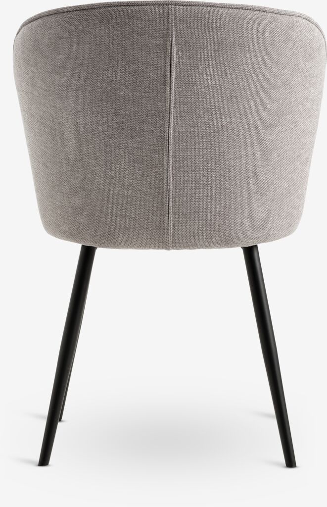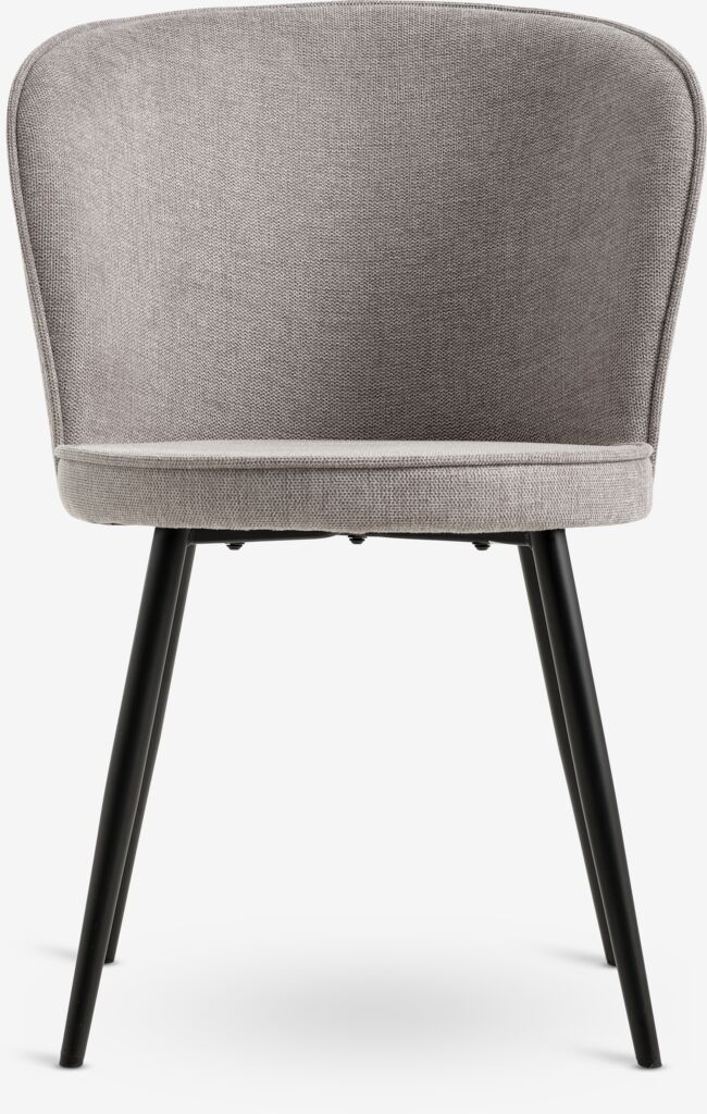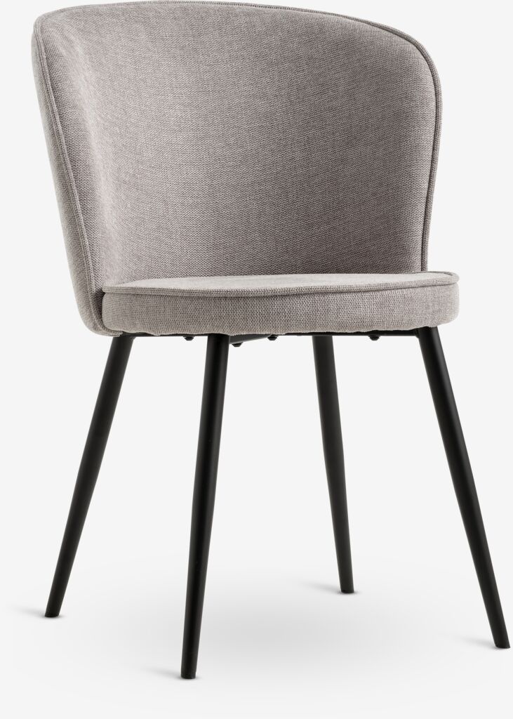 Blagovaonska stolica s podstavljenim sjedalom i zaobljenim naslonom od sive tkanine. Crne noge od čelika.