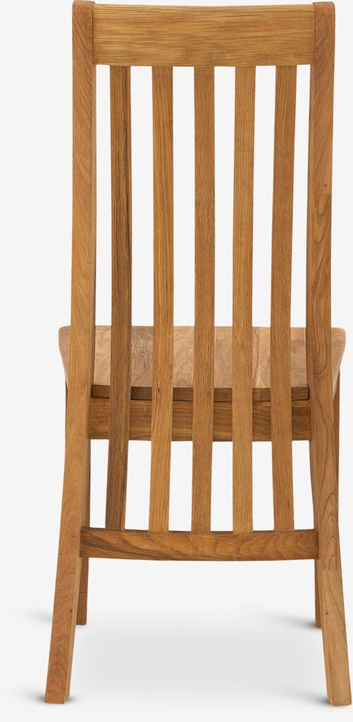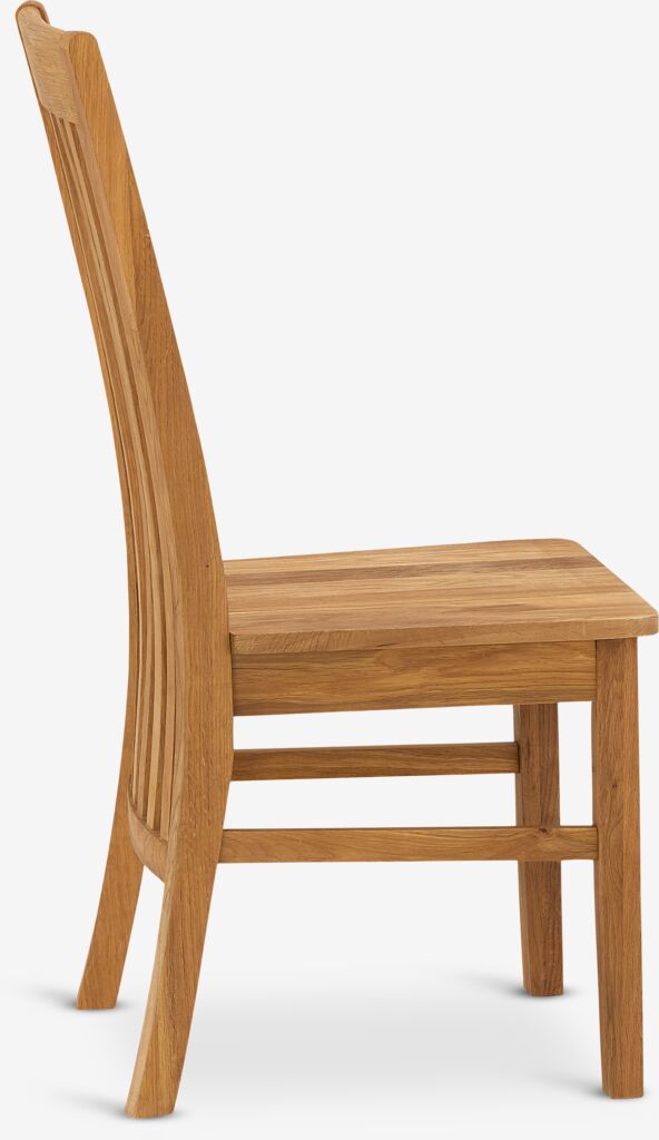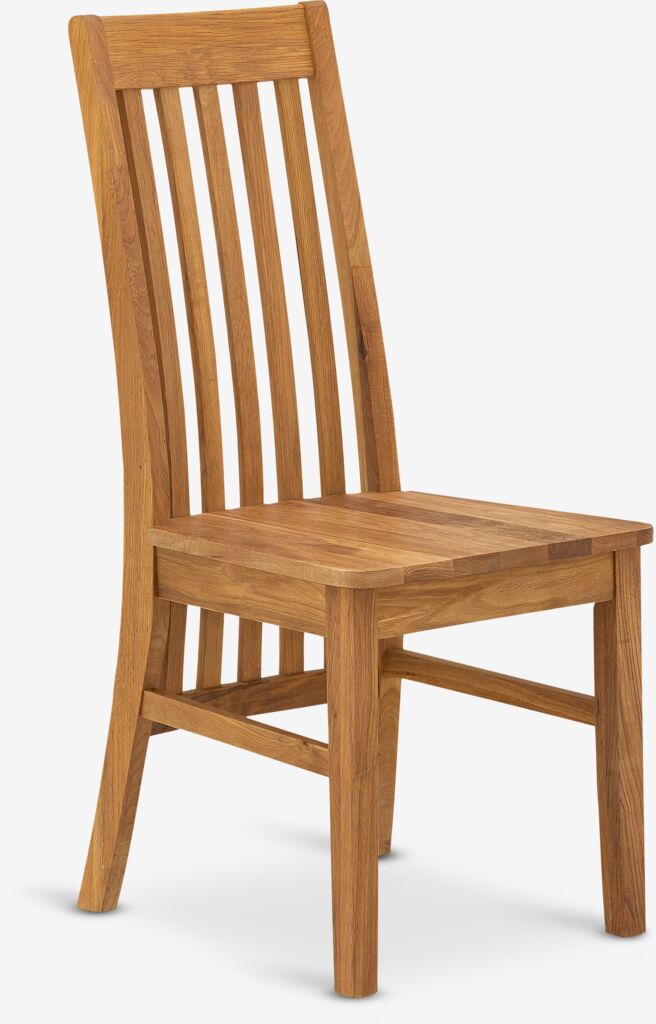 Blagovaonska stolica od masivnog hrasta s visokim naslonom. Drvo je tretirano uljem kako bi se zaštitilo i istaknula njegova prirodna boja.