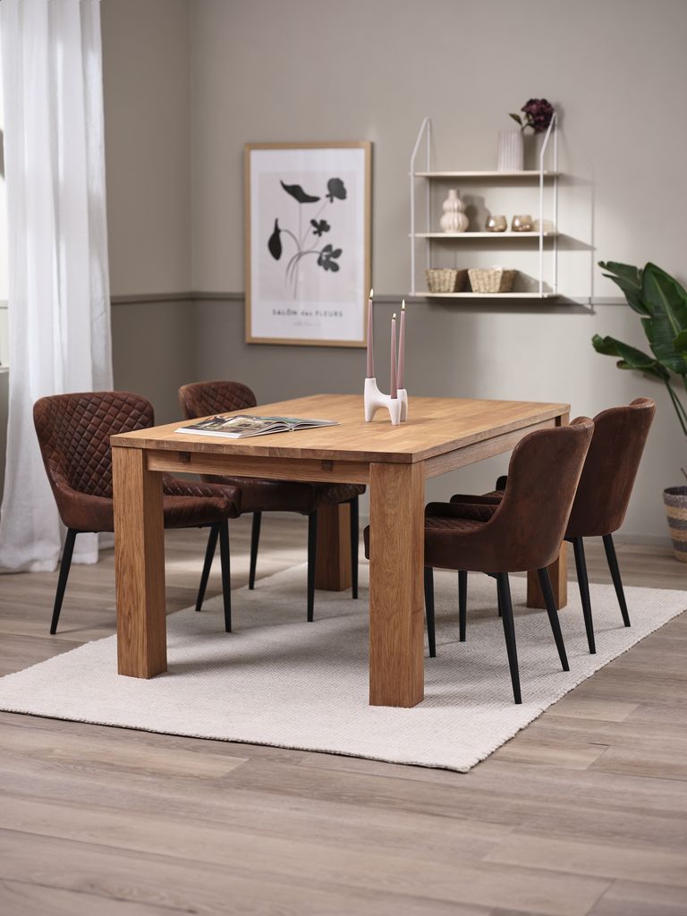 Stol: Masivni hrast i hrastov furnir. Bez dodatnih krila. Š100xD160xV75 cm. Stolice: Tkanina i čelik.