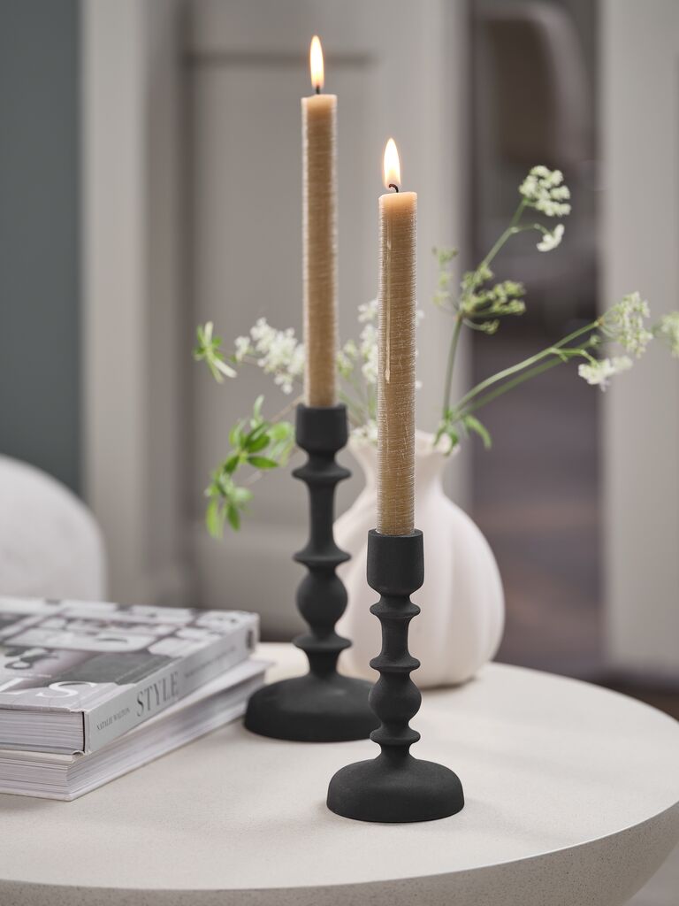 Svijećnjak od crnog aluminija s klasičnom siluetom. Smjestite ga na kamin ili blagovaonski stol kako biste stvorili ambijentalnu rasvjetu. Ø8xV16 cm
