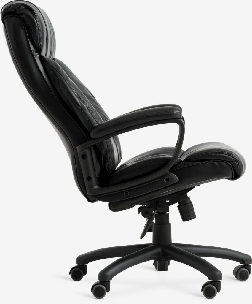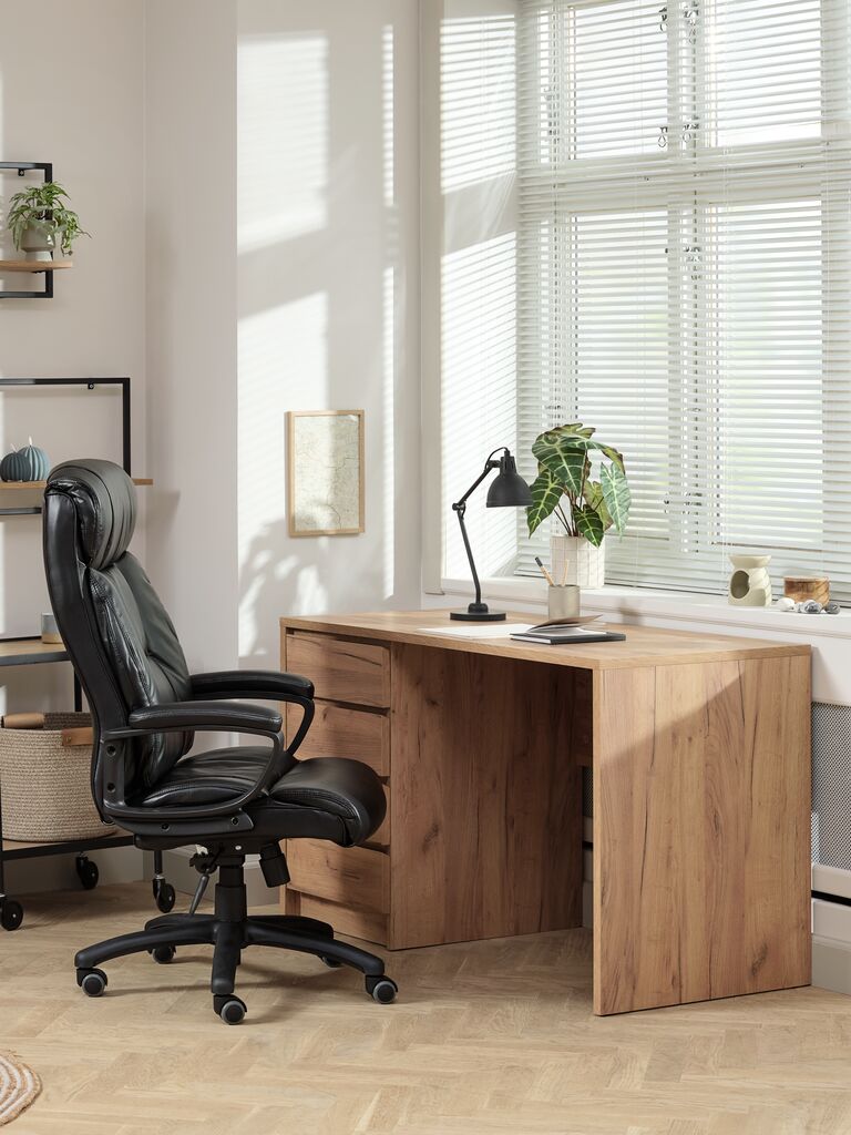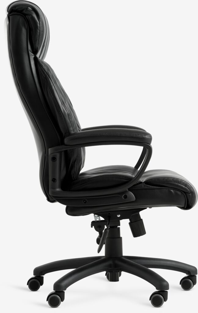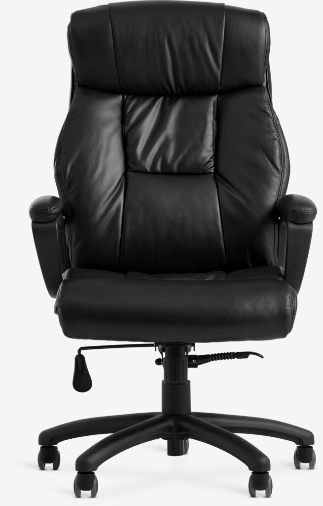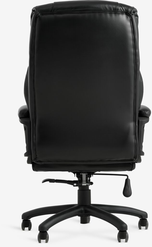 TJELE uredska stolica pruža pouzdanu udobnost i potporu tijekom vašeg radnog dana. Uredska stolica je podesiva, potporna stolica koja pomaže da vam je udobno tijekom dugih sati rada. S naslonima za ruke i značajkama poput zaključavanja nagiba u različitim položajima, ova stolica podupire pravilno držanje kako biste mogli udobno sjediti satima. Stolica je presvučena crnom umjetnom kožom. Š68xV115–125xDub77 cm