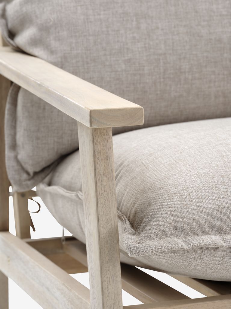 Vrtna garnitura za 4,5 osobe. Stol: Nauljeno FSC® tvrdo drvo. Š55xD100xV41 cm. Produženi dvosjed i stolice: Nauljeno FSC® tvrdo drvo. S luksuznim jastucima s dugotrajnom, grubo tkanom navlakom.