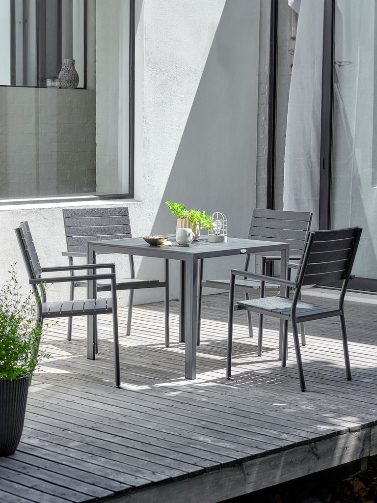 Vrtna garnitura za 4 osobe. Stol: Aluminij i umjetno drvo. Š90xD90xV74 cm. Stolice: Aluminij i umjetno drvo. Mogu se slagati jedna na drugu.