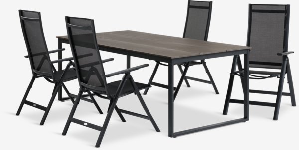 Vrtna garnitura za 4 osobe. Stol: Aluminij, čelik i umjetno drvo. Š100xD210xV74 cm. Stolice: Aluminij i tekstilen. Sa 6 položaja. Sklopive.